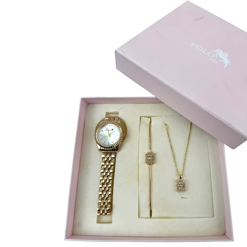Set obuhvata elegantan, precizan sat i usklađene komade nakita (ogrlicu/narukvicu), oboje izvedeno u bogatom tonu. Detaljno obrađene površine i klasičan dizajn daju mu upečatljivu, prestižnu notu, dok kvalitetna izrada garantuje dugotrajan sjaj i besprekornu udobnost.
