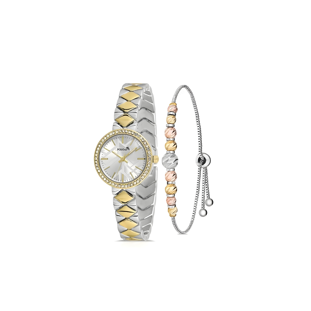 Ovaj elegantni zlatni set, koji sadrži ženski sat i narukvicu u istom stilu, idealan je za dame koje vole sofisticiran i usklađen izgled.