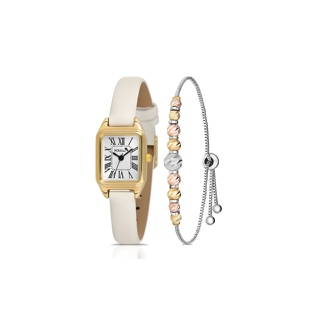 Ovaj elegantni zlatni set, koji sadrži ženski sat i narukvicu u istom stilu, idealan je za dame koje vole sofisticiran i usklađen izgled.